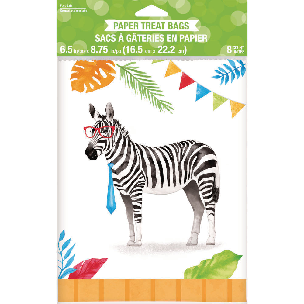 Sorprende a tus invitados con las bolsas de sorpresa safari. El paquete incluye 8 unidades de papel resistente con 4 diseños exclusivos: un mico junto al jaguar, una jirafa, un elefante y una zebra, todos decorados con globos de colores vivos que aportan alegría a tu celebración.